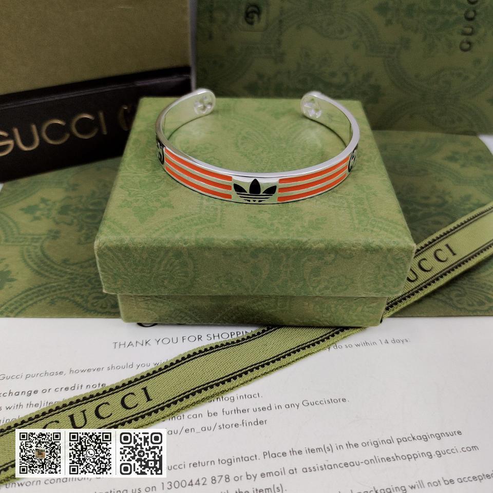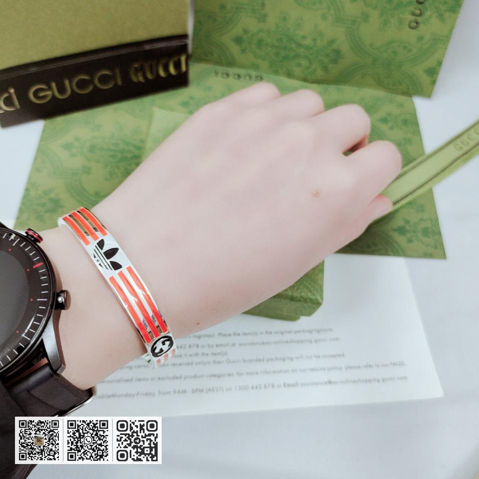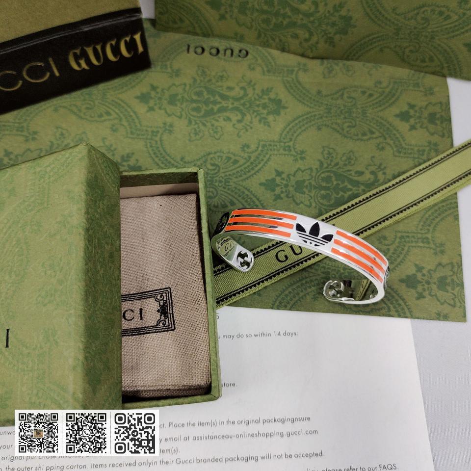 NO.202590010 GUcci adidas和GUcci联名系列推出第二篇章依然以织带和GG字母交织图案巧妙搭配橙色和三叶草标识该系列是80.90年代美号回忆融汇两个品牌丰富的悠久的历史传承及标志的设计语言塑就风格造型这款手镯有橙色和黑色三叶草标识和三条纹珐琅图案