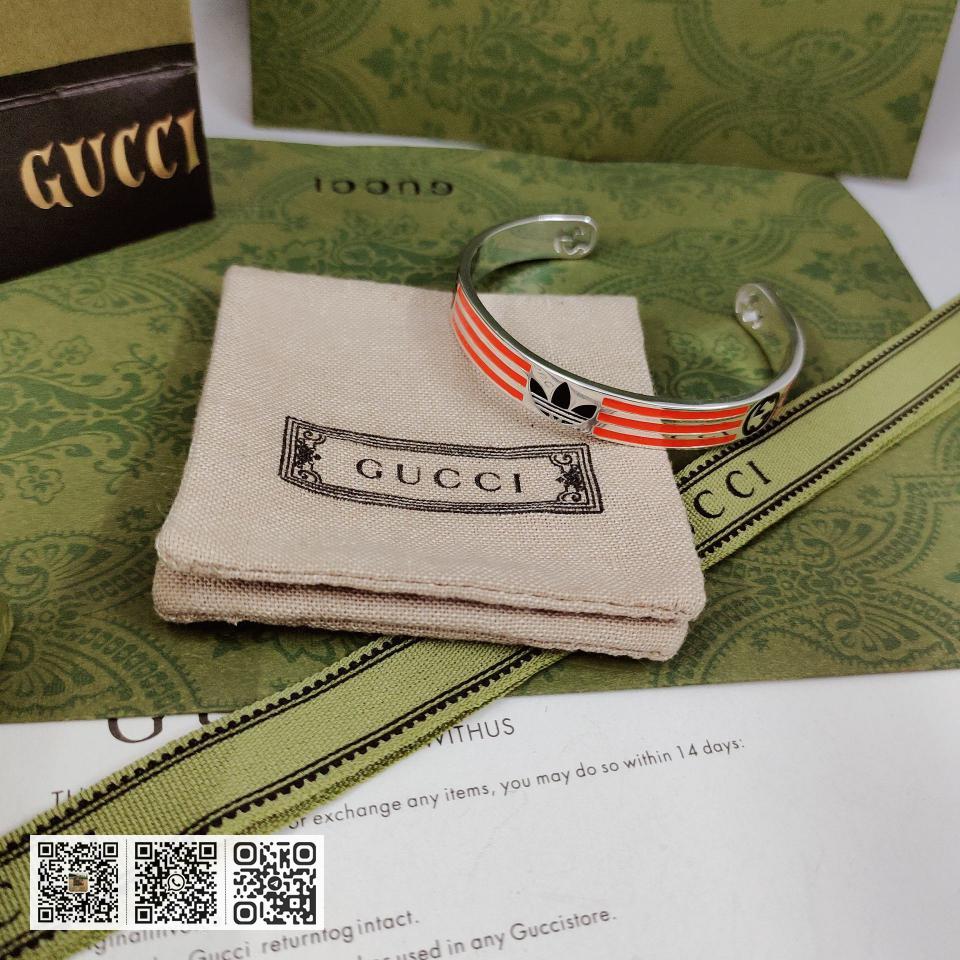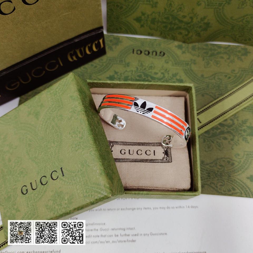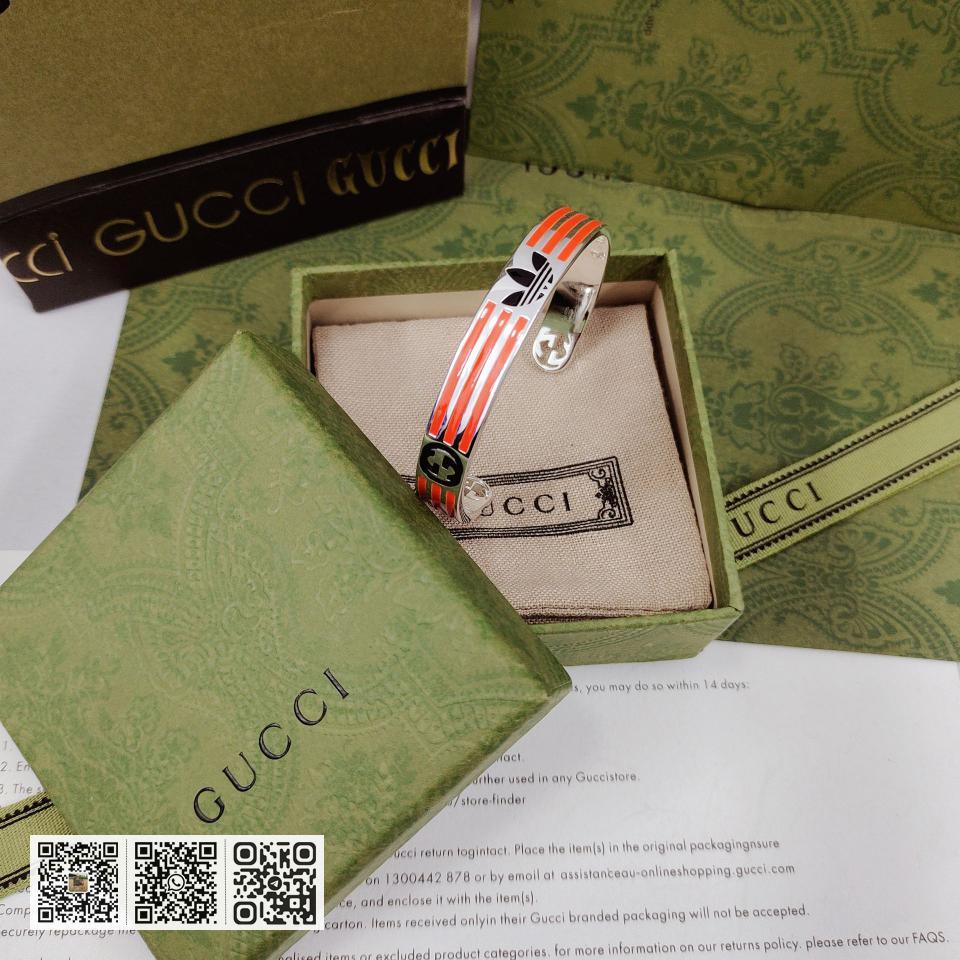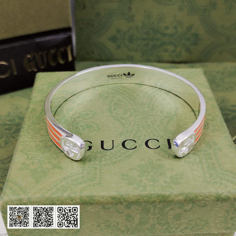 NO.202590010 GUcci adidas和GUcci联名系列推出第二篇章依然以织带和GG字母交织图案巧妙搭配橙色和三叶草标识该系列是80.90年代美号回忆融汇两个品牌丰富的悠久的历史传承及标志的设计语言塑就风格造型这款手镯有橙色和黑色三叶草标识和三条纹珐琅图案