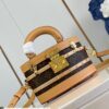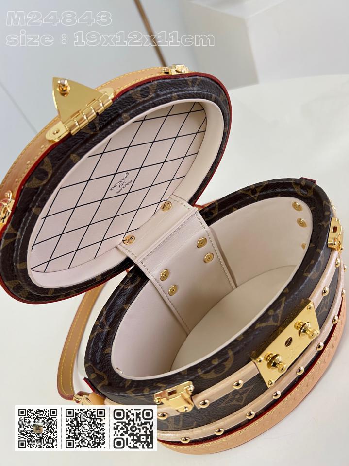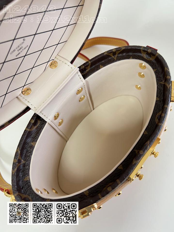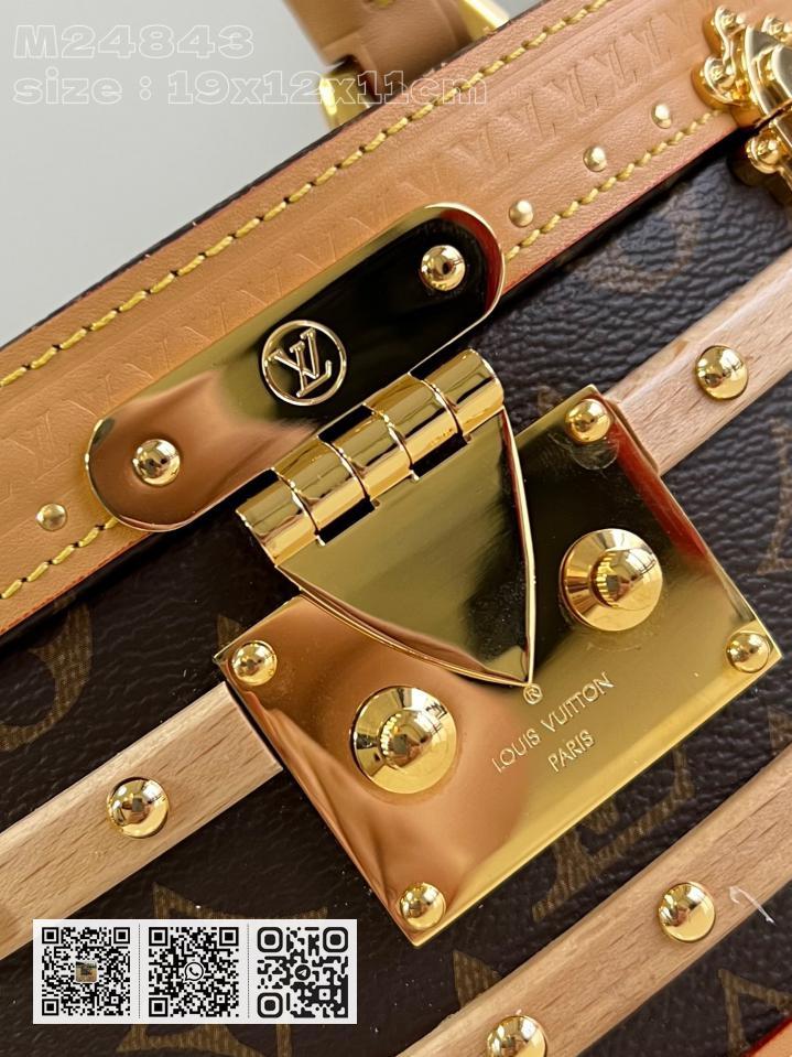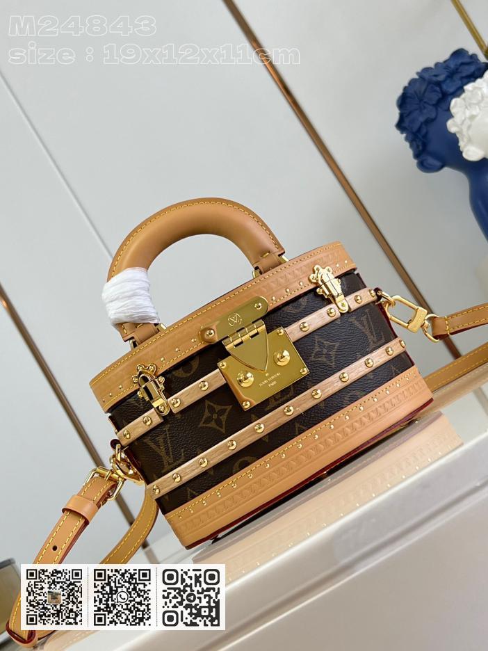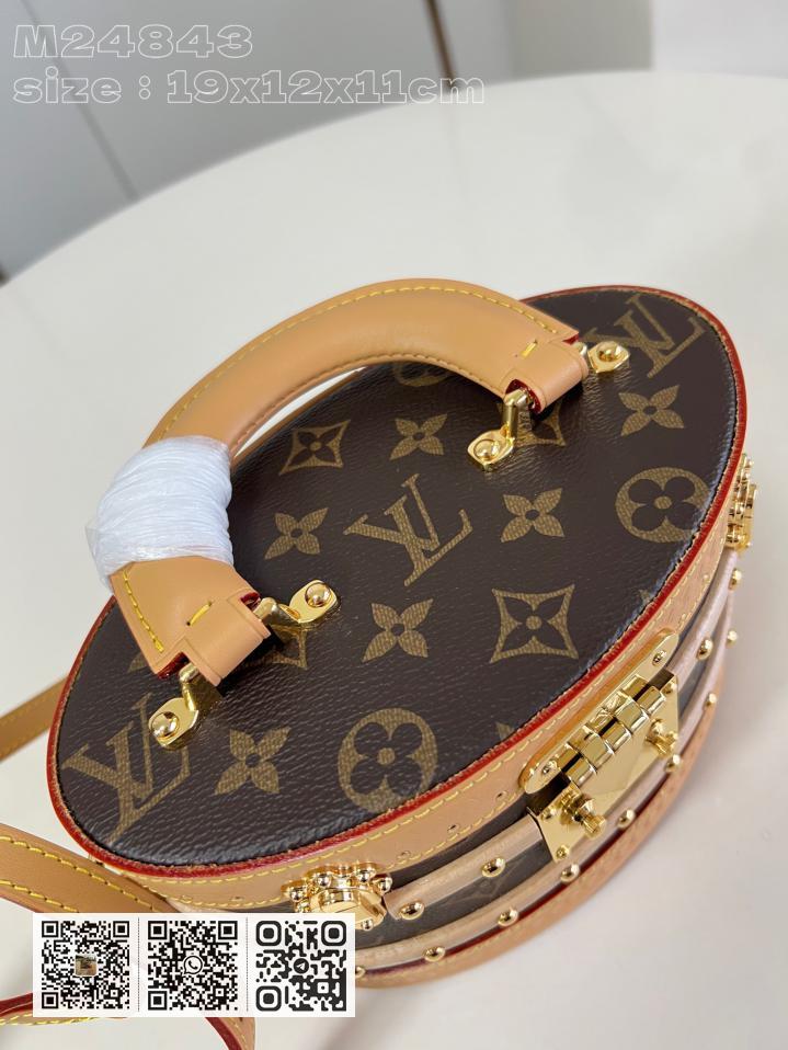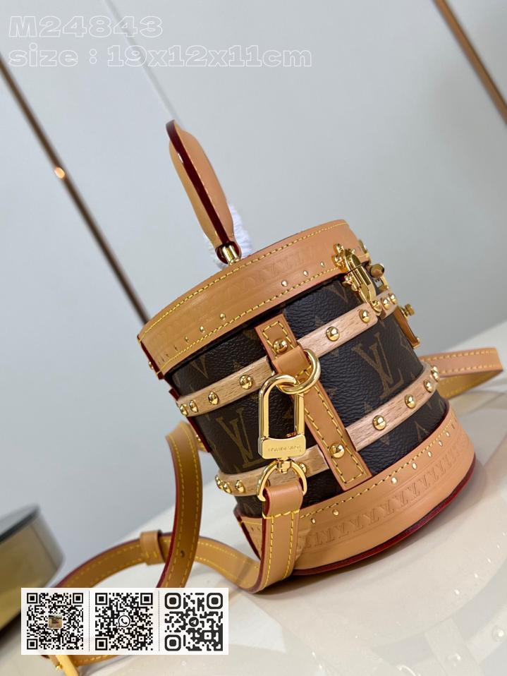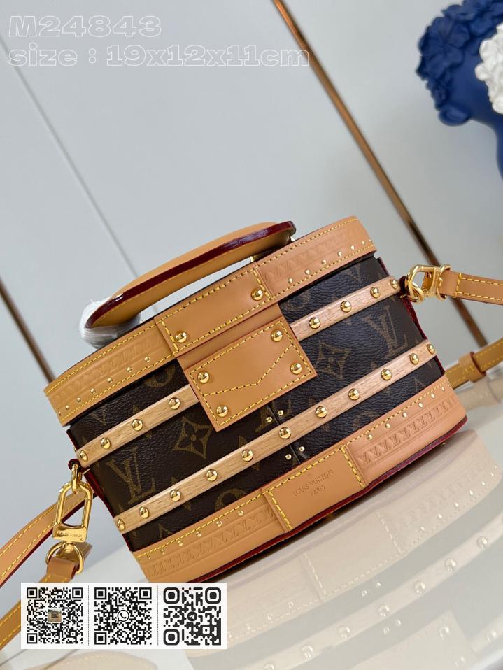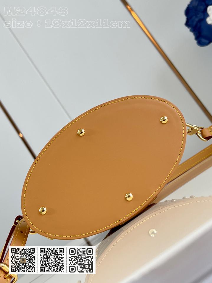 NO.20241050015【独家实拍 M24843 】本款 Ellis 手袋为 Monogram 帆布勾勒皮革和山毛榉木饰边,以木质板条点缀椭圆形轮廓,娄娓道出品牌硬箱的灵感启发。顶部皮革手柄和可拆卸并调节的皮革肩带实现手提、肩背和斜挎体验。 19.5 x 12 x 11.5公分 (长度 x 高 x 宽)